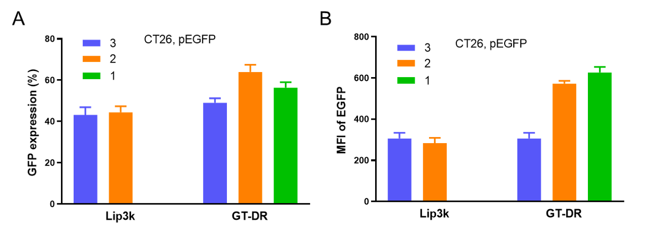 图2. 长春金传科技有限公司的GoldenTran-DR产品在CT26细胞内转染pEGFP质粒24h的转染效率(A)和平均荧光强度(B)。不同颜色柱子代表转染试剂与pDNA的体积质量比(μL:μg)。
