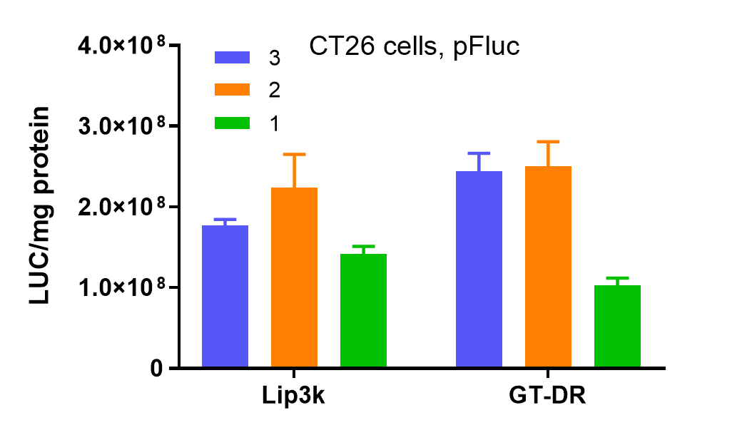 图3. 长春金传科技有限公司的GoldenTran-DR产品在CT26细胞内转染pFluc质粒48h的转染效率。不同颜色柱子代表转染试剂与pDNA的体积质量比(μL:μg)。