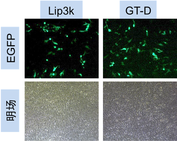 图1. 长春金传科技有限公司的GoldenTran-D产品在C2C12细胞内转染pEGFP质粒24h的绿色荧光蛋白表达和细胞明场照片。