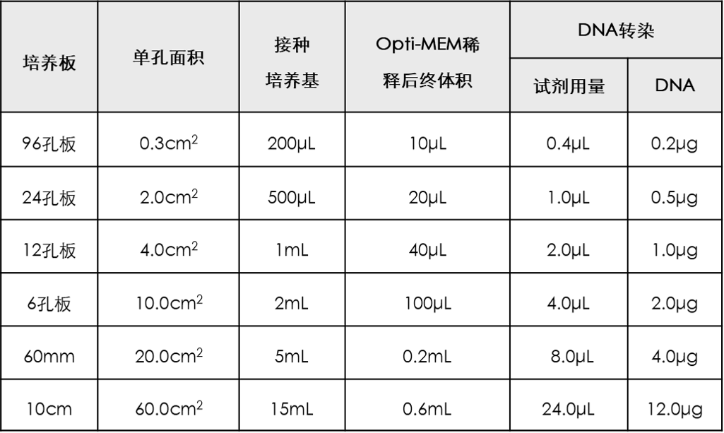 1. 需自备OPTI-MEM培养基,用以稀释转染试剂和质粒DNA。