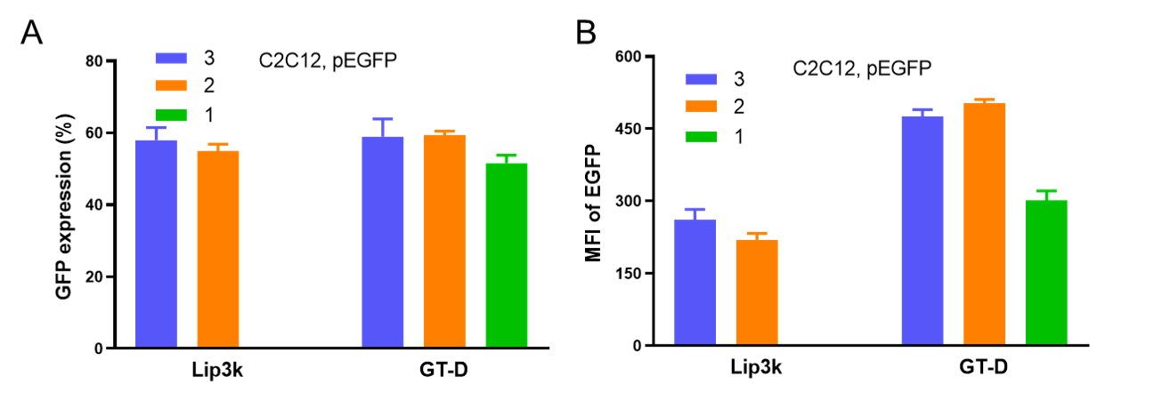 图2. 长春金传科技有限公司的GoldenTran-D产品在C2C12细胞内转染pEGFP质粒24h的转染效率(A)和平均荧光强度(B)。不同颜色柱子代表转染试剂与pDNA的体积质量比(μL:μg)。