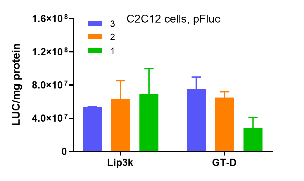 图3. 长春金传科技有限公司的GoldenTran-D产品在C2C12细胞内转染pFluc质粒48h的转染效率。不同颜色柱子代表转染试剂与pDNA的体积质量比(μL:μg)。